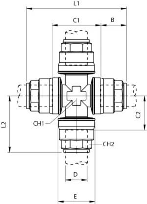| Varenummer | D | E | B | C1 | C2 | L1 | L2 | CH1 | CH2 | Pakkestr. |