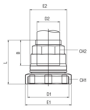 | Varenummer | D1 | D2 | B | E1 | E2 | L | CH1 | CH2 | Pakke str. |