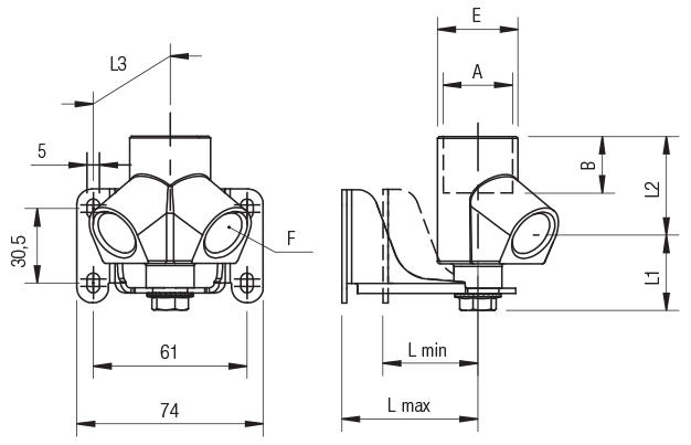 | Varenummer | F | A | B | E | L1 | L2 | L3 | Lmin | Lmax | Pakke str. |