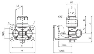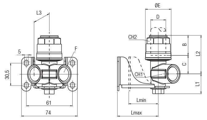 | Varenummer | D | F | B | C | E | I | L1 | L2 | Lmin | Lmax | CH1 | CH2 | Pakke str. |