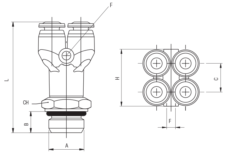 | Varenummer | Ø | A | B | C | L | H | CH | F | Pakkestr. |